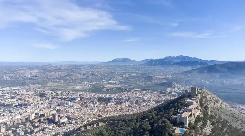 Lo que más me impresiona de su ubicación es el dominio visual que ofrece. Desde este cerro se pueden contemplar unas panorámicas realmente espectaculares que abarcan prácticamente toda la provincia. Al norte y al oeste se extiende la campiña y Sierra Morena, un territorio fértil surcado por el valle del río Guadalquivir y repleto de olivos; al sur se pueden ver la Sierra Sur de Jaén y los parques periurbanos de Santa Catalina y Monte la Sierra; mientras que al este se divisa Sierra Mágina, un territorio históricamente vinculado a la frontera del Reino de Granada.